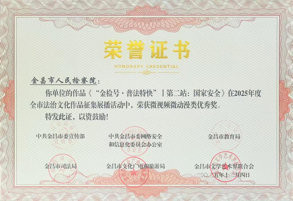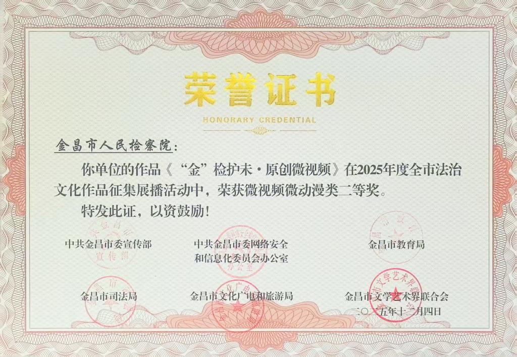 近日,由中共金昌市委宣传部、中共金昌市委网信办、金昌市教育局、金昌市司法局、金昌市文化广电和旅游局、金昌市文联六家单位联合举办的“建设美好新金昌 法治护航伴我行 ”2025年度全市法治文化作品征集展播活动获奖名单揭晓,由金昌市人民检察院报送的《“金”检护未•原创微视频》荣获微视频动漫类二等奖,《“金检号·普法特快”丨第二站:国家安全》《检徽之下•青春作答》荣获微视频动漫类优秀奖。